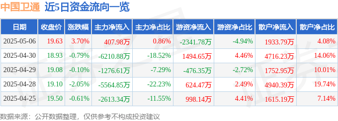 证券之星消息,截至2025年5月6日收盘,中国卫通(601698)报收于19.63元,上涨3.7%,换手率0.58%,成交量24.43万手,成交额4.74亿元。