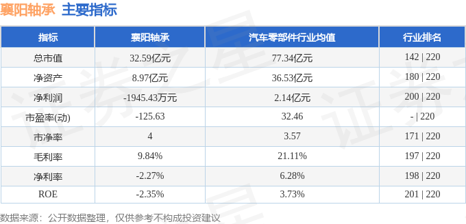 襄阳轴承2024年三季报显示,公司主营收入10.95亿元,同比下降8.3%;归母净利润-1945.43万元,同比上升56.34%;扣非净利润-3028.46万元,同比上升46.65%;其中2024年第三季度,公司单季度主营收入3.98亿元,同比下降23.68%;单季度归母净利润-704.83万元,同比下降41.6%;单季度扣非净利润-1099.19万元,同比上升15.47%;负债率62.04%,投资收益92.47万元,财务费用2212.39万元,毛利率9.84%。襄阳轴承(000678)主营业务:从事轴承及其零部件的生产、科研、销售及相关业务。