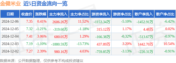 12月6日的资金流向数据方面,主力资金净流入2606.26万元,占总成交额11.52%,游资资金净流出1153.34万元,占总成交额5.1%,散户资金净流出1452.91万元,占总成交额6.42%。