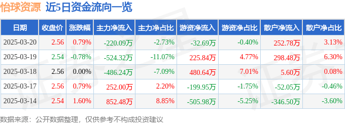 股票行情快报:怡球资源(601388)3月20日主力资金净卖出220.09万元