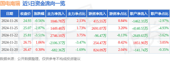 股票行情快报:国电南瑞(600406)11月26日主力资金净买入1046.78万元