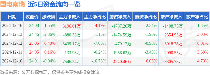 股票行情快报:国电南瑞(600406)12月16日主力资金净买入3196.01万元